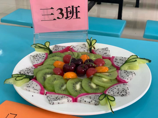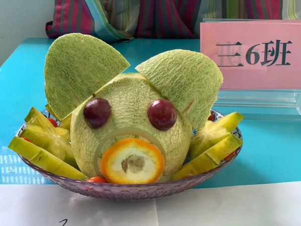 首先進行的是“水果拼盤”比賽。每班組成一個美食小隊制作“水果拼盤”,比賽中,參賽選手們全神貫注,互相配合、分工合作,力爭展示自己的獨特創意,更增添了此項比賽的藝術性。一個個普通的水果在同學們的靈心巧手之下變成一個個藝術品,富有詩意的拼盤名字更突顯同學們深厚的文學水平,對拼盤創意的精彩解說展現了同學們明捷的思維和伶俐的口齒。評委老師對拼盤作品嘖嘖稱嘆,對同學們的表現贊不絕口,活動評選出“垂涎欲滴獎”、“創意滿分獎”、“色香俱全獎”。