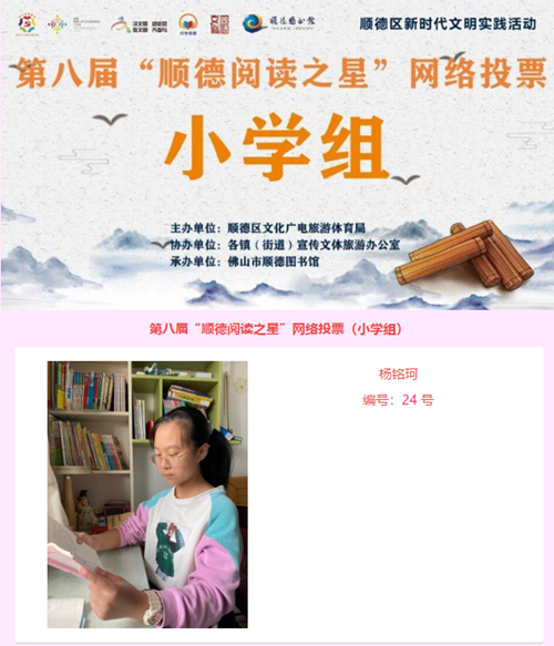 三月,我校楊銘珂同學入圍第八屆“順德區(qū)閱讀之星”評選。楊銘珂同學從小就開始培養(yǎng)自己的閱讀習慣,對書籍充滿興趣。楊同學認為閱讀就是充實自己的最好方式,也是提升自我實力、豐富人生的一劑良藥。