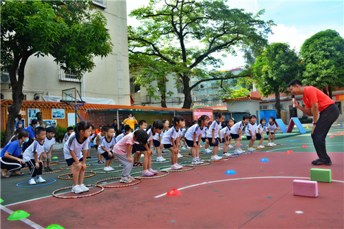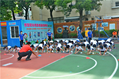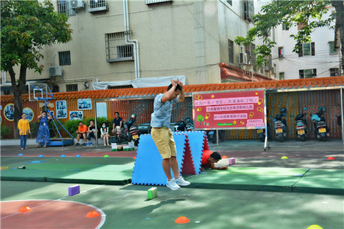 活動第三站,學校劉志明老師帶領幼兒園小朋友們上了一節趣味盎然的體育課。帶領小朋友們做好充分地熱身準備后,劉老師根據龜兔賽跑的課程主題,學習了烏龜與兔子賽跑的姿勢,融入了對應角色,進行賽跑活動教學。幼兒園小朋友們各展所能,竭盡全力地奔赴終點。