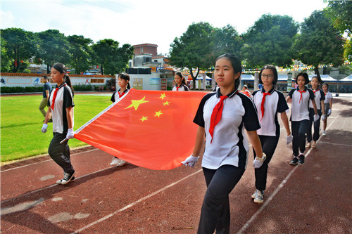 活動第一站,幼兒園小朋友們和奮揚學子代表在學校操場上共同參與升旗儀式。幼兒園小朋友們看著奮揚學子整齊有序的隊伍、莊嚴的站姿、規范的升旗禮,體驗到了升國旗時的莊嚴與肅穆。