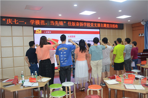 “我志愿加入中國共產黨……”梁煒琴副書記帶領全體黨員教師重溫入黨誓詞。鏗鏘有力的誓詞,重溫一次,洗禮一次,使黨員們牢記自己是一名共產黨員,為黨的事業奮斗終身。