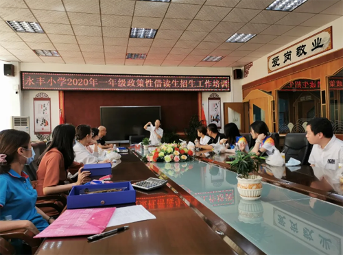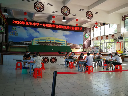2020年6月27日,永豐小學進行了一年級政策性借讀生報名登記。當天早上,只見校道上整整齊齊擺放著一米間隔的紅凳子,在晨光的照射下顯得格外醒目。還沒到8點,負責報名登記的老師就已經(jīng)來到學校,在進行一年級政策性借讀生招生前,何主任集合大家進行了一次招生工作前的培訓,再次提出明確的要求,此次報名工作一定要做細心耐心。