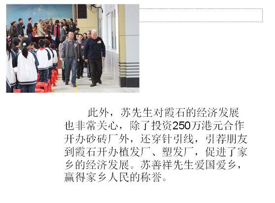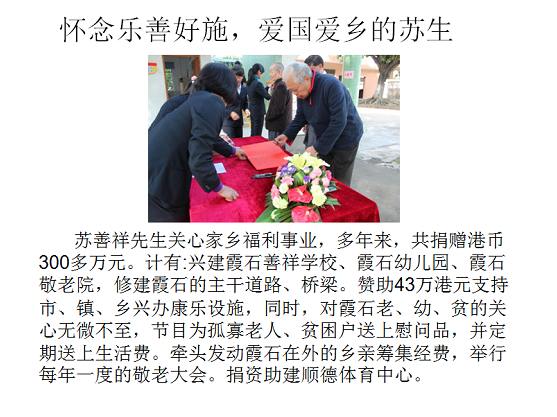 班會課上,同學們了解到善祥先生是一位樂善好施、受人尊敬的企業家,多年來一直為家鄉建設與教育事業作出巨大的貢獻。多年來,他共捐贈港幣300多萬元支持家鄉建設。為了促進家鄉的經濟發展,他不僅投資250萬港元合作開辦砂磚廠,還穿針引線,引薦身旁朋友到霞石投資設廠;為了敬老尊老,他興建敬老院,并每年牽頭發動霞石在外的鄉親籌集經費,舉行每年一度的敬老大會;為了發展教育,他投資興建了霞石善祥學校和霞石幼兒園,舉辦獎教獎學大會,獎勵認真讀書的學生和勤奮的老師們,關注霞石學子的成長。這位可愛的老人對家鄉的感情深厚,總是想方設法地為鄉親們做著一件件力所能及的事情,他無私的大愛,贏得了村民對他的敬佩和贊頌。