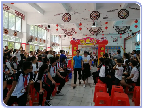最激動人心的時刻到了!由各班班主任帶領著同學們走過畢業門,上臺接受吳校長頒發的畢業證書,并拍照留念。