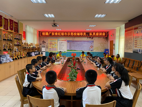 接著,考評小組在會議室開展輔導員、隊員的座談會。兩位專家老師針對少先隊的規章制度、隊歌、隊會組織、學生組織能力的培養、隊會的流程等方面和輔導員代表、隊員代表進行了一次深入的訪談。