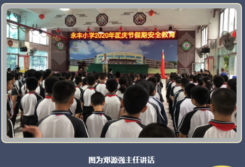 中秋、國慶兩節即將到來,為了使全體師生過一個愉快而又安全的 “ 十一 ” 長假,嚴防安全事故發生,確保生命及財產安全。9月28日上午,永豐小學堅持預防為主的原則,開展了中秋及國慶節前安全教育。