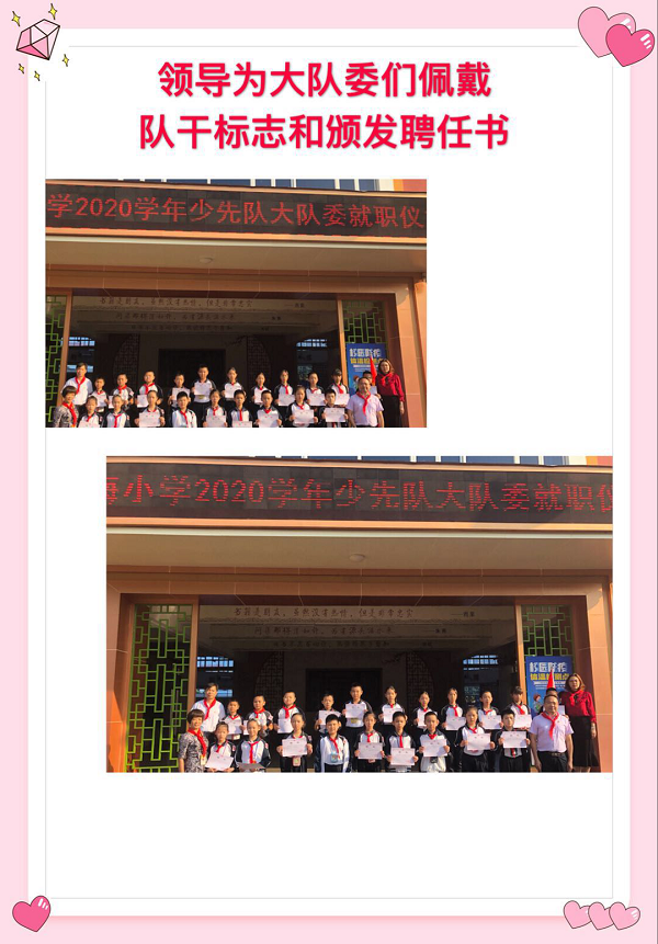 本次的就職儀式由大隊(duì)輔導(dǎo)員張麗君老師宣讀了新一屆大隊(duì)委員的名單。在全體輔導(dǎo)員和隊(duì)員們熱烈的掌聲中,新當(dāng)選的大隊(duì)委成員走上升旗臺(tái)亮相。北海小學(xué)少工委主任何小祥、輔導(dǎo)員黎瑞萍、何永泉、容穎一起為大隊(duì)委親手佩戴隊(duì)干標(biāo)志和頒發(fā)聘任書。隨后由大隊(duì)長(zhǎng)周彥霏作就職演講,最后,大隊(duì)委員們?cè)陉?duì)旗下莊嚴(yán)宣誓,一聲聲鏗鏘有力的宣誓聲,表達(dá)了他們做好少先隊(duì)工作堅(jiān)定的決心。
