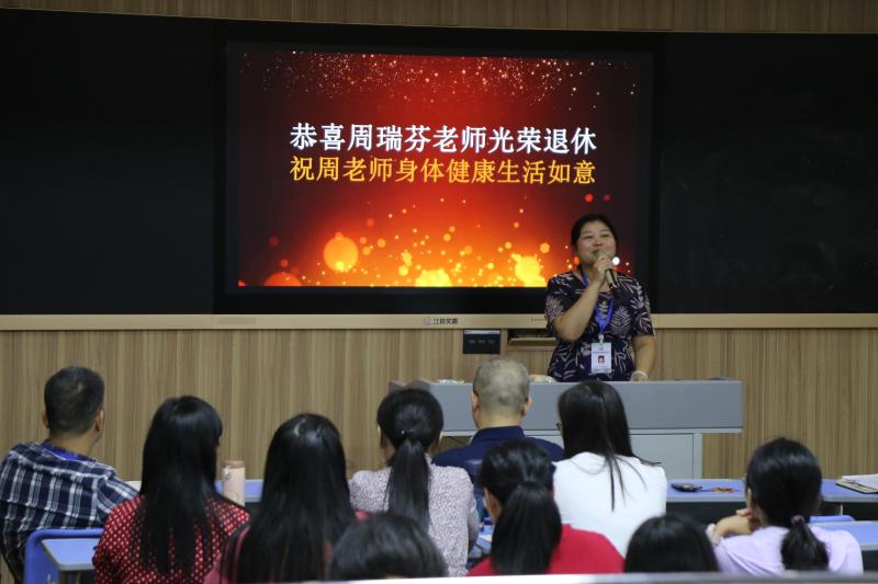 大屏幕前,幻燈片和著音樂,翻開了周老師的華美篇章,展現了她光輝的教育歷程。傅文芳校長發表了熱情洋溢的講話,周老師用樸實嚴謹的風格,教育了一屆又一屆學生;她用宅心仁厚的品格,影響了一批又一批教師。她兢兢業業,無私奉獻,把最美好的芳華都獻給了教育事業。她是我們敬重的前輩,是我們學習的榜樣!”隨后周老師深情回顧了自己工作的經歷,并感謝學校召開如此隆重的榮休座談會。