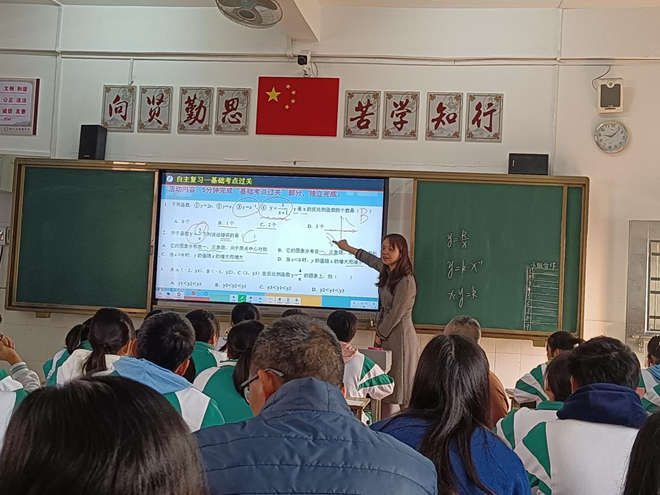 課堂上周偉萍老師從基礎考點過關開始,從常考知識點與學生循循善誘,語言親切,讓學生如沐春風,學生如在和風暖陽中收獲知識。之后用思維導圖進行歸納。而后通過重難點突破中的用希沃白板的函數技術對反比例函數幾何性質進行動態演示,最后點亮廣東省中考壓軸題的反比例函數的思維火花,使數學課堂與信息技術高度相融合。陽山老師聽完課后不經意間脫口而出的“厲害”道出所有老師的聽課心聲。