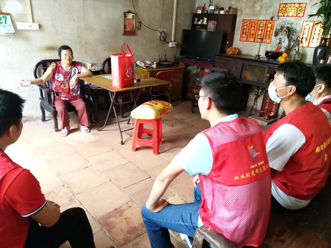 活動當天,三位黨員教師早早來到江義村委,在江義村委組織帶領下,他們扛著大米等慰問品來到江義村幾戶獨居老人家中,黨員們圍著老人噓寒問暖,陪老人聊天、講笑話,老人們對大家的到訪非常高興,在與老人的交流過程中,黨員們還詳細詢問了老人的身體狀況以及生活情況,了解他們生活上遇到的困難和難處,設法幫助解決。
