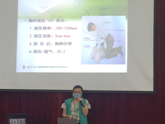 本次知識講座分為理論知識講解和實際操作兩部分,張醫(yī)生采用PPT形式,從心跳呼吸驟??砂l(fā)生的場所、個體、心肺復蘇概念、黃金救命時間等方面做了詳細的介紹,同時結(jié)合不同傷情下應采取的不同急救措施,對心肺復蘇各環(huán)節(jié)技術和流程進行了現(xiàn)場示范。