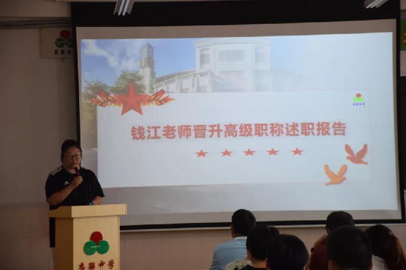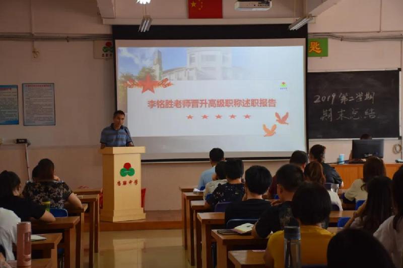 2019學年第二學期期末總結大會由錢江副校長主持,大會分為三個流程。一是十位申報晉升高級職稱的教師進行述職報告;二是趙平正校長發言并公布下學期的教學分工安排;三是表彰大會。