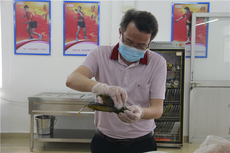 粽葉和糯米經過老師們的巧手加工,成了一件件精美獨特的藝術品。溫馨的飯堂瞬間充滿歡聲笑語,處處洋溢著端午節的熱鬧氣氛。隨著一件件藝術品陸續出爐,現場的氣氛推向高潮。