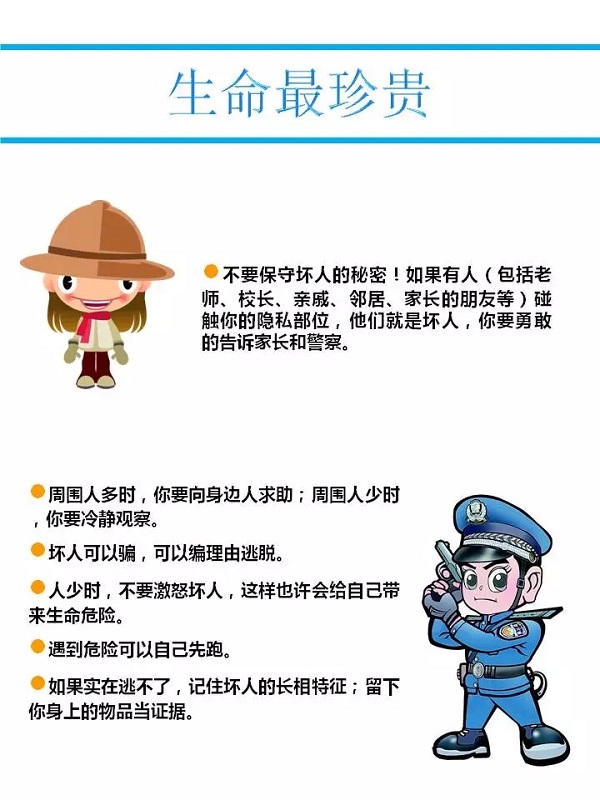 危險都是潛在的,預防是最有力的武器。所以一定要把功夫花在平時,為孩子布好全方位的安全防護網,提高孩子的隱私意識、警惕性和自我防護能力。
