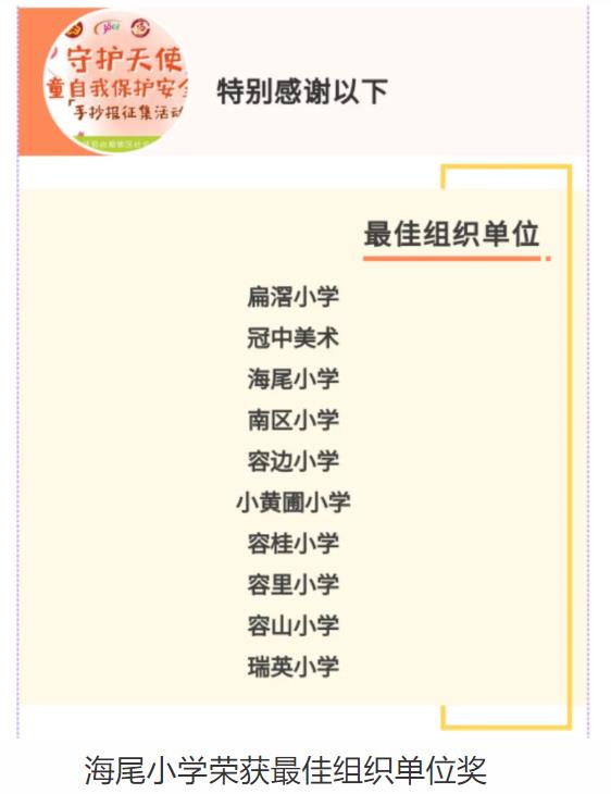 2020年8月,容桂育美教育集團海尾小學學子在假期參加由佛山市消防安全委員會指導、共青團佛山市委員會、佛山市消防救援支隊、佛山市教育局主辦的佛山市第三屆中小學生消防主題繪畫大賽。以及由容桂街道婦聯、容桂婦女兒童維權站、容桂舒心驛站、容桂愛家園?家庭暴力防護中心聯合舉辦的“守護天使”――兒童自我保護安全教育手抄報創作大賽。在黃嘉茵老師的指導以及各位同學的努力下,我校多份作品捷報頻傳。