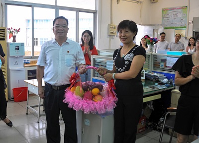 接著,容桂街道黨工委、辦事處領導一行來到了辦公室向老師們進行慰問,劉書記感謝老師們在疫情期間付出的努力,他贊揚老師們疫情期間堅守崗位,關注學生身心健康,時刻留意著學生情況,并積極與家長做好溝通工作。最后,劉書記代表政府向老師們送上最誠摯的節日祝福和慰問果籃,老師們紛紛對慰問領導一行表達了感謝。