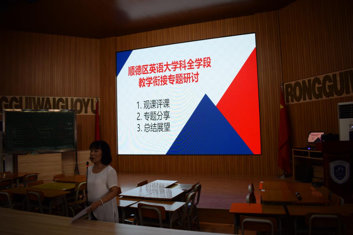 為了總結上學年英語學科大教研工作經驗,研討并部署新學期教研工作,積極推進區域聯合教研,形成學科內學段銜接的大教研機制和各級各類教研合力,9月8日下午,本學期英語學科大教研工作會議于容桂外國語學校召開,順德區教育發展中心教研員田湘軍、杜曉曦、許莎莎,容外副校長周劍山,以及來自不同鎮街和學校的英語科組長,各年級備課組長參加了會議。會議由容桂外國語學校英語科組長楊通蘭主持。