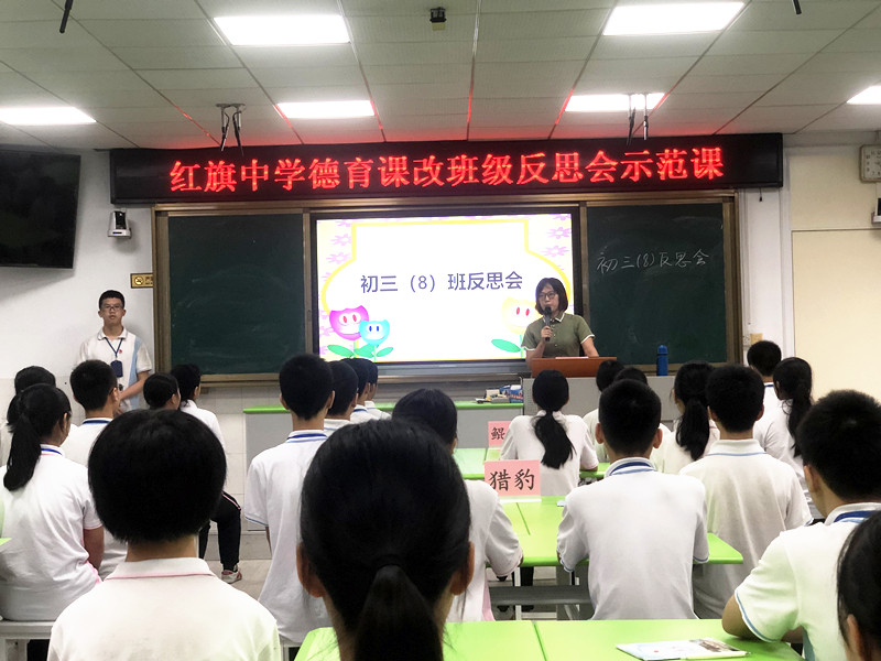 反思會示范課在初三8班同學熱烈響亮的班級誓詞宣讀中拉開了序幕。展示活動由學生主持,并依次按照班干部事務點評、組長總結、我建議、我表揚、我反思等課堂流程循序開展,規范進行。參與活動展示的學生積極參與、自信大方、善于思考和質疑,展現了優秀的個人風采和班級風貌。最后,班主任譚老師的精彩點評更是將活動推向了高潮。