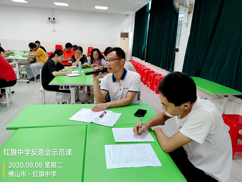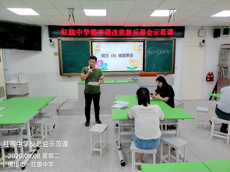 2020年9月8日下午,紅旗中學全體班主任齊聚錄播室觀摩了譚志霞老師的德育課改反思會示范課,德育處陳國佳副主任主持了課后的分享交流會。陳亞玲校長等學校主要行政領導參加了活動。