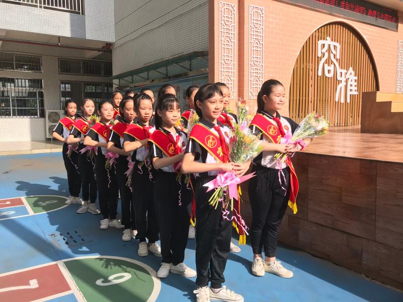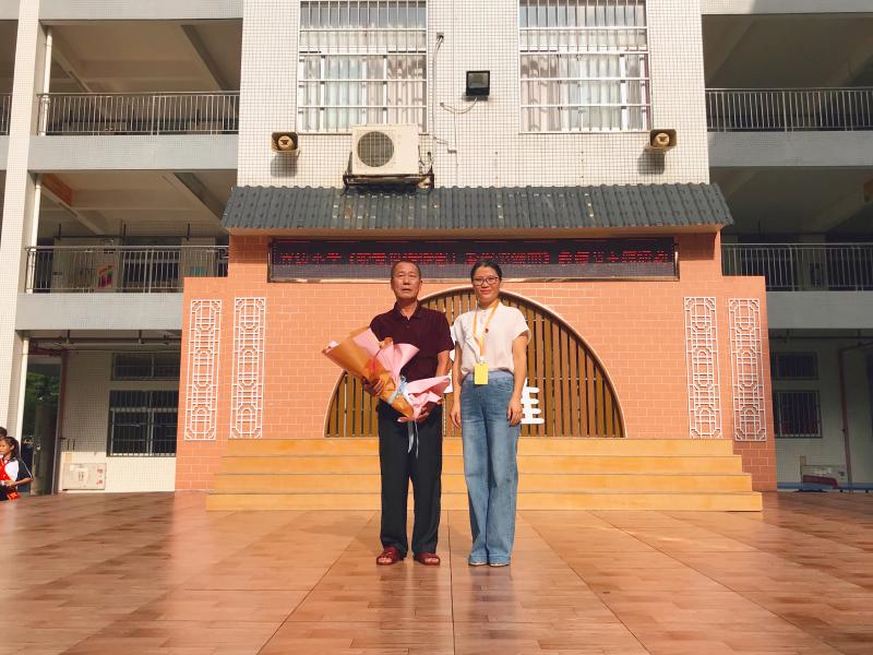 之后,活動迎來“給辛勤的園丁”獻花環節。首先,是彭海云校長為容邊小學退休的吳校長獻上美麗的鮮花,感謝他半輩子用心做教育,做學生的引路人。接著,容邊小學容雅禮儀隊隊員為各科組老師們依次獻花,并由彭海云校長為全體老師頒發教師節紀念賀卡。最后,彭海云校長為“三十年教齡”的老師馮城發副校長和李綺雯副校長獻上獻花,感謝他們為教育事業奮斗了三十年,付出了自己的青春,辛勞耕耘。