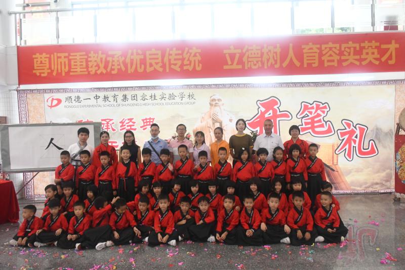 9月28日,一個莊嚴恢弘的主席臺搭建在大堂正中央,兩邊屏風環(huán)繞,禮、儀、孝、悌、忠、信、廉、恥的條幅點綴其中。順德一中教育集團容桂實驗學校一年級新生“開筆禮”儀式,就這樣成功地搶占了學校頭條。穿戴整齊的漢服萌娃們,跟隨級長譚淑儀老師的引領,跟隨班主任老師的腳步,踏著古詩韻律,合掌緩緩進入會場,拉開了活動的序幕。嘉賓席上,許勇輝先生校長、德育處李福古副主任等行政領導與一年級的家長朋友們,共同見證了這一神圣的時刻,現(xiàn)場響起一片經久不息的贊嘆聲和掌聲。