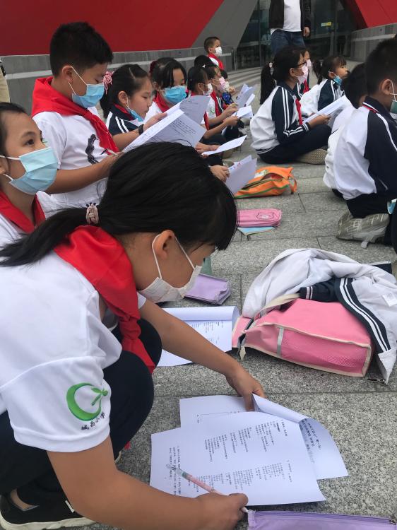 秋天的陽光活潑又溫柔,學生們熱情高漲、步履輕快,下午2:30四個學校的參與同學在工業館門口集結完畢?;顒酉扔尚↑S圃小學的張德林主任做一個關于工業發展館的簡單介紹,學生們在工業館門口就地而坐,聽得津津有味。接著容邊小學童詩教研部主任梁秀玲老師給學生發學習單,并指導學生觀察工業發展館的外觀,讓學生根據觀察所得捕捉好靈感并做好記錄。