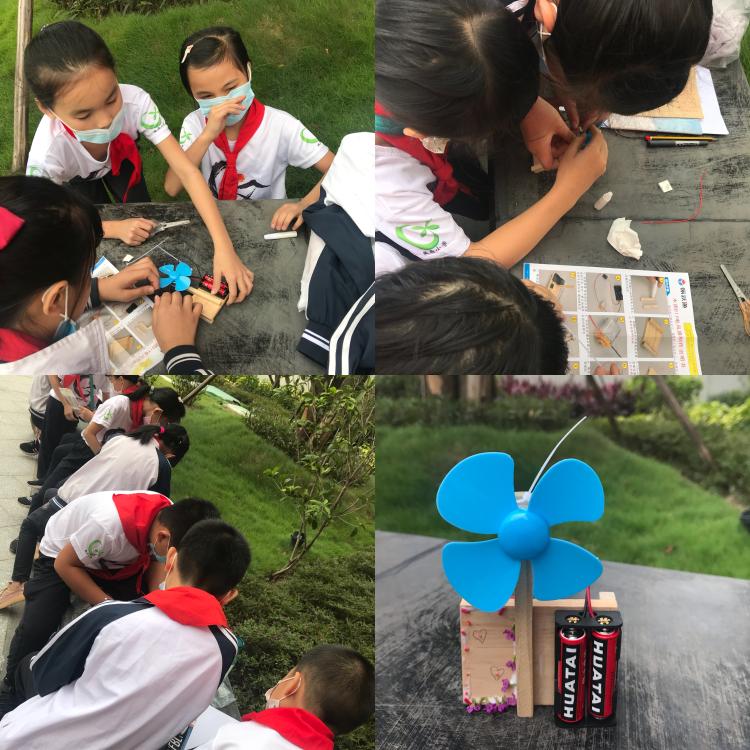 最后同學們在小黃圃小學老師的示范下開始制作小風扇實驗,學生們兩人一組合作制作,小組兩人一起研讀說明書,既分工合作又親密無間地快速將小風扇組裝起來。組裝完風扇之后,就開始創作詩歌,詩歌創作完后同學之間相互交流討論進行自我修改。謝志穎主任和黎珍弟老師則針對學生修改后的作品進行適當的點撥,進行第二次的修改。最后讓同學們把詩歌抄在做好的小風扇上。