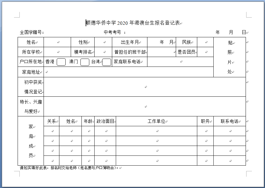 一、報(bào)考條件和要求 (一)報(bào)考必達(dá)條件 具有順德區(qū)學(xué)籍并具備以下條件之一的應(yīng)屆初中畢業(yè)生: 1、港澳地區(qū)考生,具有香港或澳門(mén)居民身份證和《港澳居民來(lái)往內(nèi)地通行證》; 2、臺(tái)灣地區(qū)考生,具有在臺(tái)灣居住的有效身份證明和《臺(tái)灣居民來(lái)往大陸通行證》; 考生所持證件必須在有效期限之內(nèi),且有效期須達(dá)2023年6月。 (二)報(bào)考要求 達(dá)到報(bào)名條件的港澳臺(tái)籍應(yīng)屆畢業(yè)學(xué)生,須參加2020年佛山市初中畢業(yè)生學(xué)業(yè)考試和高中階段學(xué)校招生考試(即中考)。 二、招生人數(shù):45人 三、錄取辦法 (一)報(bào)名 報(bào)名時(shí)間:2020年5月22日至6月3日 報(bào)名方式:網(wǎng)上報(bào)名 1. 將下面的報(bào)名材料打包發(fā)送至電子郵箱:648298028@qq.com 2. 微信掃碼碼進(jìn)入順德華僑中學(xué)港澳臺(tái)班中招咨詢?nèi)海⑿薷娜好瑸?/span>“xx學(xué)校+姓名” 報(bào)名材料: 1、港澳地區(qū)考生,香港或澳門(mén)居民身份證和《港澳居民來(lái)往內(nèi)地通行證》掃描件; 2、臺(tái)灣地區(qū)考生,在臺(tái)灣居住的有效身份證明和《臺(tái)灣居民來(lái)往大陸通行證》掃描件; 3、完整填寫(xiě)港澳臺(tái)生報(bào)名登記表(見(jiàn)附件)。 咨詢電話:22323905麥老師,22803565陳老師,13679727668潘老師 13316328928胡老師 ,15820692683涂老師 (二)面試 面試時(shí)間:2020年6月6日 面試報(bào)到時(shí)間:8:30―9:00 面試報(bào)到地點(diǎn):華僑中學(xué)辦公樓四樓會(huì)議室 面試時(shí)間:9:00―11:30 面試要求:考生必須戴口罩參加面試,進(jìn)校門(mén)時(shí)必須測(cè)溫、亮碼,顯示正常者方可進(jìn)入校園,在面試等候區(qū)必須按前后左右至少1米的間距就坐。 (三)錄取 通過(guò)面試的考生,網(wǎng)上填報(bào)志愿時(shí)需在第二批第一層次中選填“華僑中學(xué)港澳臺(tái)生班”志愿;錄取時(shí),區(qū)招生辦將根據(jù)考生志愿、中考文化科成績(jī)及招生計(jì)劃,由高分到低分投檔錄取。 順德區(qū)華僑中學(xué) 2020年05月22日