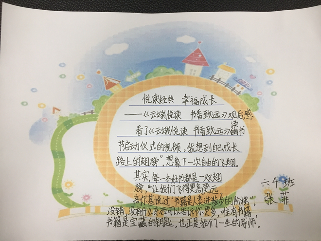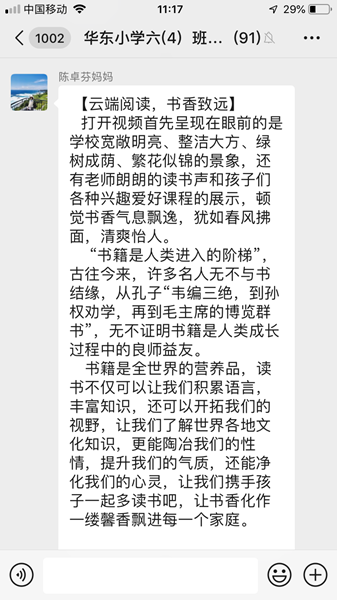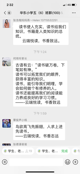 恰逢今天是五、六年級(jí)學(xué)生返校,于是本次活動(dòng)分線下和線上釘釘直播兩部分進(jìn)行。首先,由龍家怡老師向五、六年級(jí)全體師生介紹本次活動(dòng)的意義和介紹讀書節(jié)啟動(dòng)儀式活動(dòng)流程。其次,由葉麗燕副校長(zhǎng)詳細(xì)解讀本學(xué)期讀書節(jié)活動(dòng)方案。然后,學(xué)生們觀看讀書節(jié)啟動(dòng)儀式視頻并撰寫觀后感。一到四年級(jí)的讀書節(jié)啟動(dòng)儀式在釘釘班群上也同時(shí)進(jìn)行。班主任通過直播向?qū)W生、家長(zhǎng)介紹了本次云端讀書節(jié)活動(dòng),對(duì)學(xué)生的閱讀方法進(jìn)行指導(dǎo)后,觀看讀書節(jié)啟動(dòng)儀式視頻。視頻中,龍江鎮(zhèn)教育局教研專干陳金梅、龍江鎮(zhèn)教育局德育專干和專職責(zé)任督學(xué)劉自力、李耀宗校長(zhǎng)、各行政干部、骨干教師代表、家長(zhǎng)和學(xué)生代表通過引用關(guān)于“讀書”的名人名言,號(hào)召全體師生多讀書,讀好書,積極參與到讀書節(jié)的各項(xiàng)活動(dòng)中去。在看完了讀書節(jié)啟動(dòng)儀式視頻后,同學(xué)和家長(zhǎng)紛紛表示:視頻拍得太好了,讓人深深陶醉在書香中。六(4)班彭誠(chéng)真同學(xué)在觀后感里面寫到:書籍,可以滋養(yǎng)我們的靈魂。讓我們與書相伴,幸福成長(zhǎng)。二(6)班劉雅婷家長(zhǎng)說:為華東小學(xué)的讀書節(jié)點(diǎn)贊!讓讀書成為一種時(shí)尚,讓學(xué)習(xí)成為一種習(xí)慣。讀萬(wàn)卷書,行萬(wàn)里路!