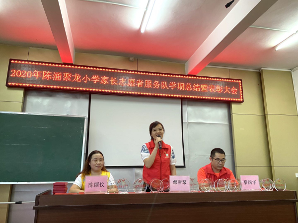 2020年7月10日下午,召開“遇見最美志愿者”---陳涌聚龍小學志愿服務隊學期總結暨表彰大會,總結本學期的志愿服務工作,表彰一批優秀敬業的家長志愿者,并慶祝聚龍小學志愿服務隊成立兩周年,志愿服務隊隊注冊成功一周年,鄒雪琴校長、學校行政及護學崗家長志愿者參加了本次活動。