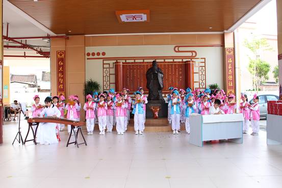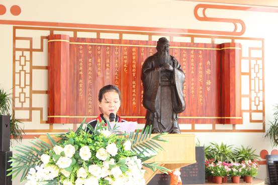活動的第一部分是孔子像揭幕儀式。首先由各位領(lǐng)導(dǎo)為孔子像揭幕,隨后由二年級學(xué)生在古琴音樂的伴奏下誦讀《論語》。聽著悠然的古箏聲伴隨著韻味十足的郎朗書聲,我們仿佛置身千年之前的課堂,并深深陶醉于濃濃的國學(xué)氛圍之中。