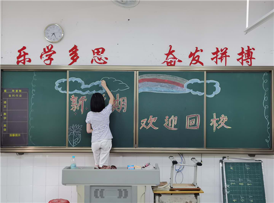 新學期 新環境 新希望 老師正在布置精美的黑板報迎接同學們回校
