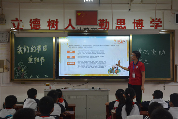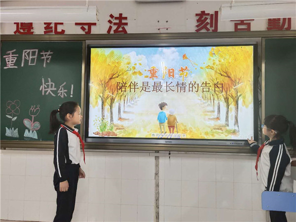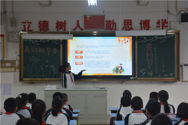 10月19日上午,各班還開展了“我們的節日?重陽”主題班會,向隊員們介紹中華傳統節日――重陽節的來歷、習俗等,并開展了主題為“情暖金秋,愛在重陽”的重陽誦讀活動。主題班會上,學生們不僅交流了對重陽節的了解,知道了重陽節的由來,別名和各地的風俗,還誦讀了一些有關重陽節的詩句,讓中華優秀傳統文化教育在校園里持續有效地進行。
