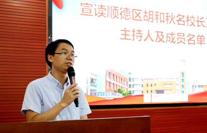 順德區教育發展中心教師發展研究室唐信焱主任宣讀順德區胡和秋名校長工作室主持人及成員,并向他們頒發聘書。