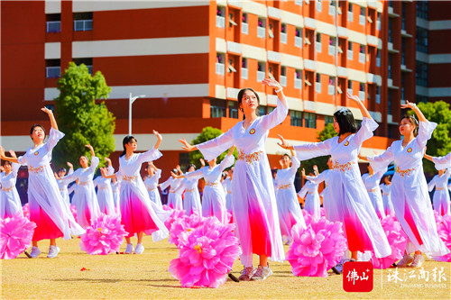 北外附校三水外國語學校高一年級的女生表演歌舞。 /珠江商報記者朱德文攝