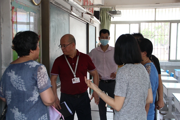 在廖杏芳校長、李敬明副校長、蔡泳儀副主任等校領導的陪同下,教育局領導們認真察看了校園環境、教學樓、校醫室、防控物資儲存室、功能場室等重點場所,深入了解學校疫情防控工作方案、防疫物資配備等準備工作。