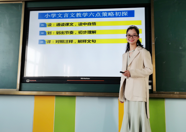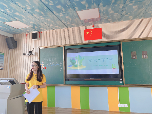 緊接著,北海小學甘容老師、梁毅鈺老師作代表,分別圍繞“小學文言文教學六點策略初探”和“文言‘序’學”這兩個主題分享教學心得。本次分享起到了一個拋磚引玉的作用,為接下來的小古文教學提供了一個新的思考方向。