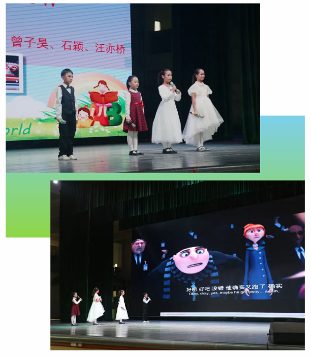 接著,小學部梁倩寧、曾子昊、石穎和汪亦橋四位同學帶來了英語動畫配音節目。該節目妙趣橫生,小配音演員在臺上仿佛與角色融為了一體。他們語氣多變、情緒飽滿、時不時還加入夸張的表演,讓場下的觀眾們如臨其境,掌聲不斷