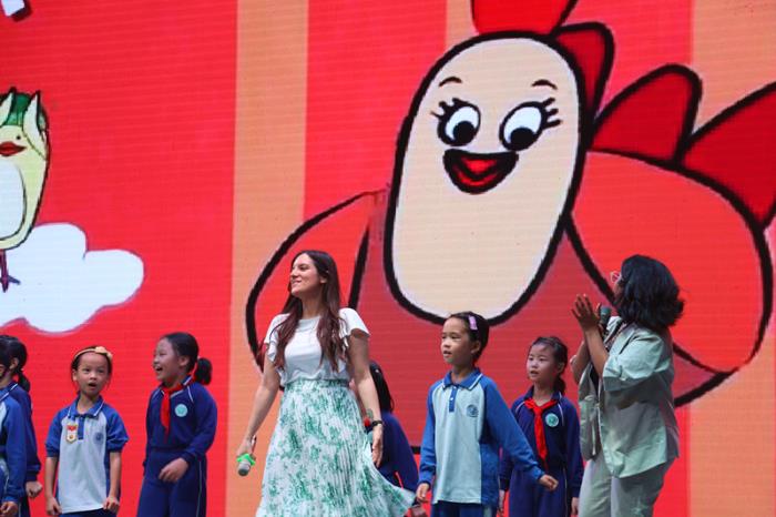 表演結束后,深受學生喜愛的Jerry、Zoe、Hafsa、Gordana四位外教老師上臺與同學們互動,他們熱情地打招呼,現(xiàn)場歡呼聲不斷。在外教老師的帶領下,全體師生演唱英語歌曲“Na Na Na”,合著音樂的節(jié)奏,臺下同學們熱情高漲,或擊打節(jié)拍,或揮舞手臂,現(xiàn)場的氣氛被點燃。