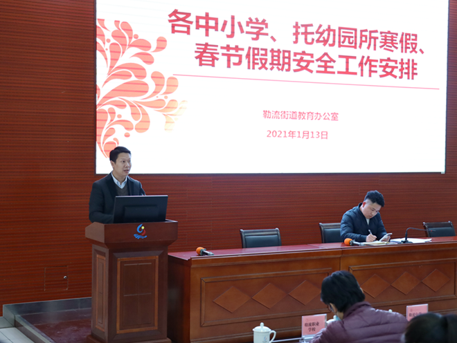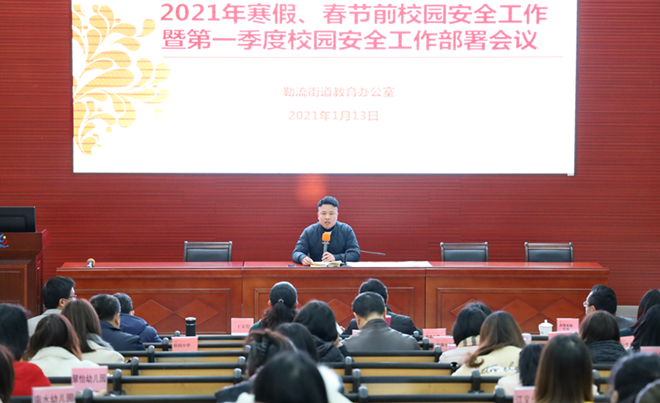 街道教育辦公室甘永杰同志總結2020年勒流街道第四季度校園安全工作情況,布置各中小學、托幼園所寒假、春節假期的安全工作,部署2021年第一季度校園安全工作,部署全街道中小學、托幼園所學期末安全巡察工作。