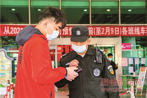 順德客運(yùn)總站安保人員在售票廳前查看市民的健康碼。/珠江商報(bào)記者朱德文攝