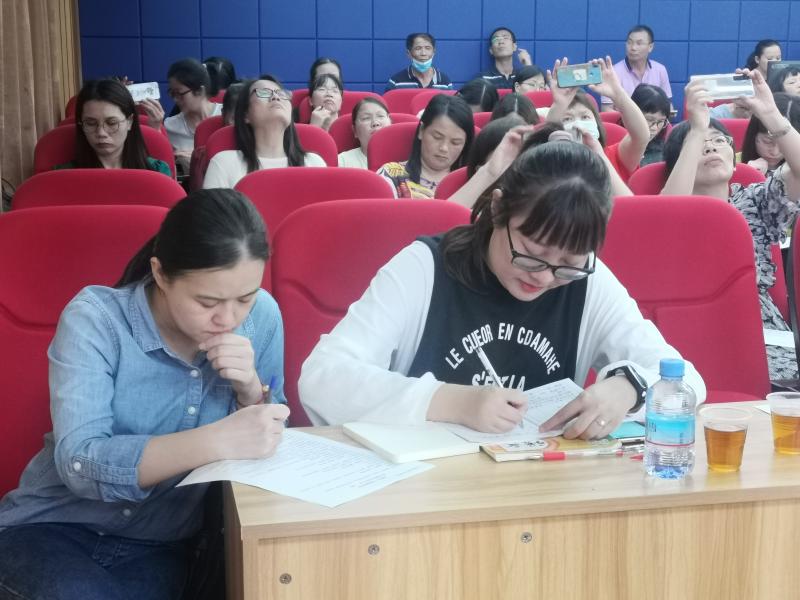 第二部分是評課環節。首先詹睿老師和肖婉瓊老師分享了自己的教學設想,容山小學的吳姿霖和宋淑婷老師也分別交流了自己的學習心得。隨后楓冼小學張雪映老師、楓冼小學王海蘭老師、新城鎮中心小學南校區梁彩燕等幾位老師紛紛表示自己在這兩節課中學習到了很多,如引導孩子表達方面,不是沒有教,而是沒有堅持下去;看到了導讀課的多樣形式,受益匪淺;同時在思考后也提出了疑問:如高年級還能用低年級讀封面這樣的策略嗎?推進課還有什么形式?分享課圍繞“課本劇、手抄報”等形式應該怎么選?詹睿老師針對這些問題一一解答,和大家進行了深入的交流。